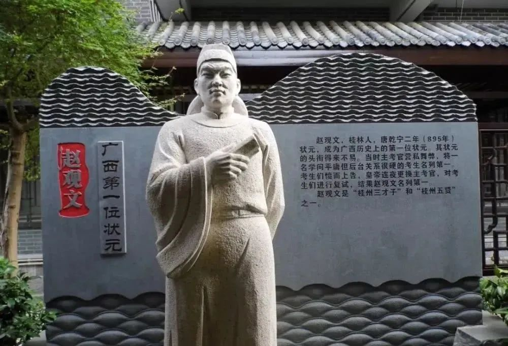 唐昭宗乾寧二年(895),這時(shí)歷史已經(jīng)進(jìn)入到唐末,貞觀之治的欣欣向榮與開(kāi)元盛世的繁華奢靡已成為遙遠(yuǎn)的夢(mèng)幻。安史之亂帶來(lái)的宦官專權(quán),外蕃割據(jù)的混亂局面到此時(shí)達(dá)到了頂峰,生于斯、長(zhǎng)于斯的趙觀文滿腹的詩(shī)書經(jīng)綸,滿腔的報(bào)國(guó)熱情終將成為明日黃花,最后激流勇退,老守田園。然而他的狀元功名的取得卻激勵(lì)了更多的廣西學(xué)子,帶動(dòng)了廣西文化的發(fā)展;他清廉不阿的品德,被后人所敬仰,并成為廣西官員學(xué)習(xí)和效仿的典范。他去世后,人們建“五賢祠”來(lái)紀(jì)念他,將他與同時(shí)代的桂林陽(yáng)朔詩(shī)人曹鄴、臨桂詩(shī)人曹唐并稱為“桂州三才子”。